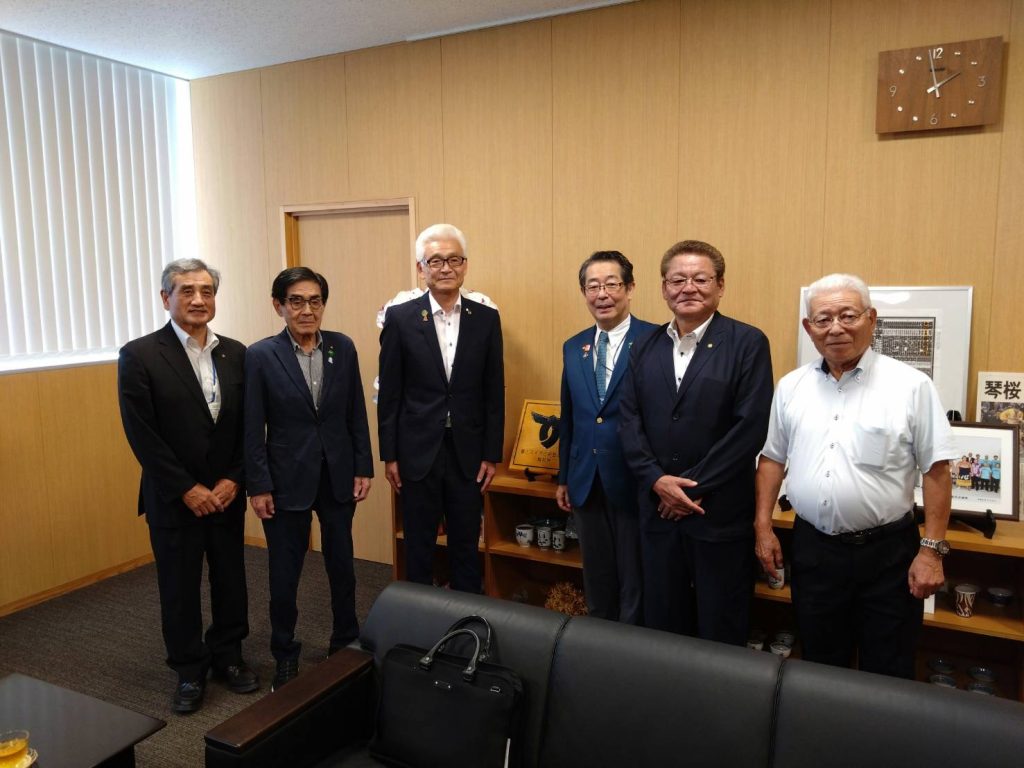 8月20 日(水)尾花沢RCと尾花沢中央RCとの合同ガバナー公式訪問の後、小松栄一ガバナー、同行の阿部清氏、後藤智樹氏、小室淳ガバナー補佐、尾花沢中央RC会長岩崎雄策、尾花沢RC会長佐々木正美、幹事星川篤が、尾花沢市役所に結城裕尾花沢市長を 表敬訪問しました。